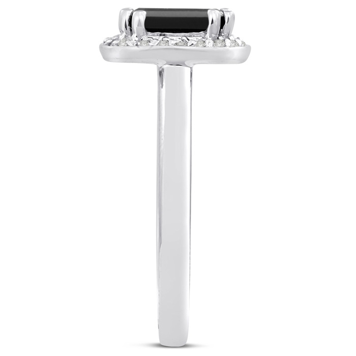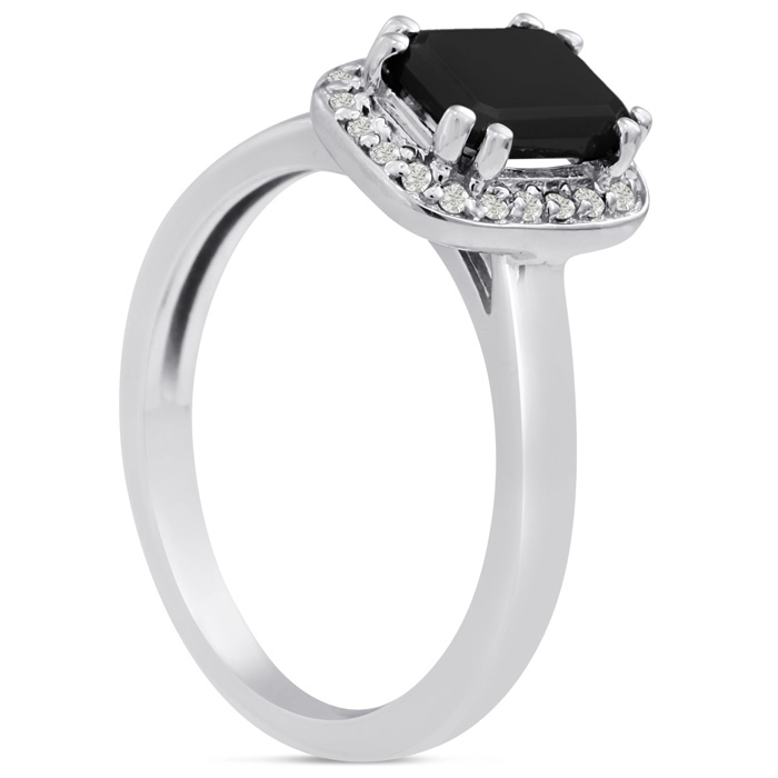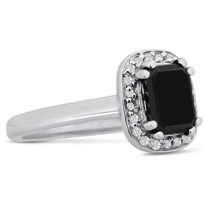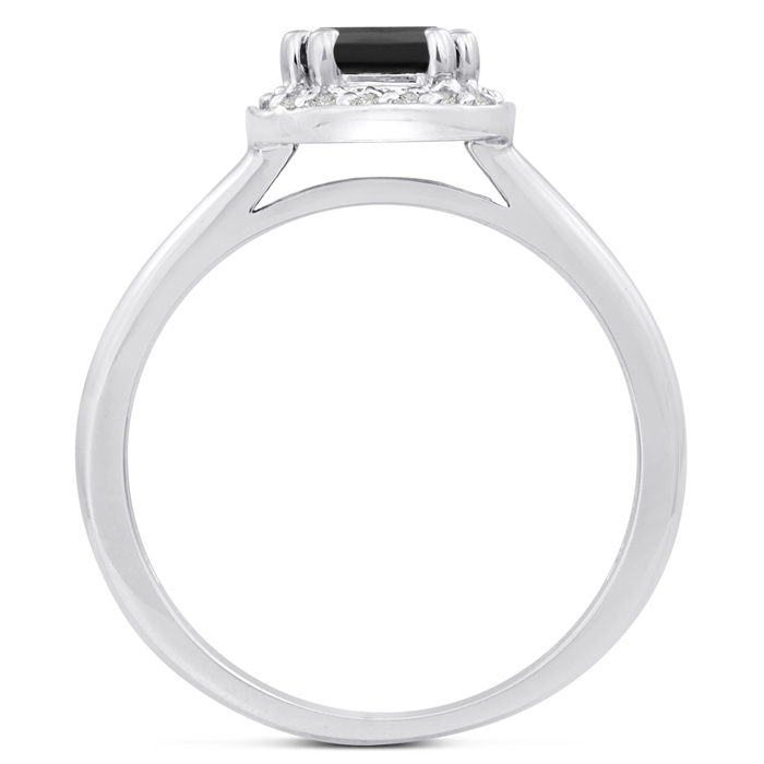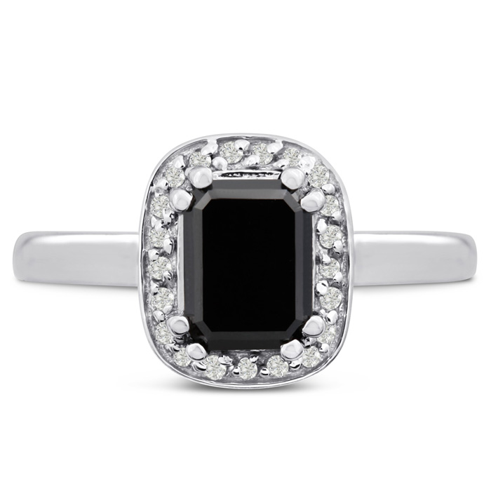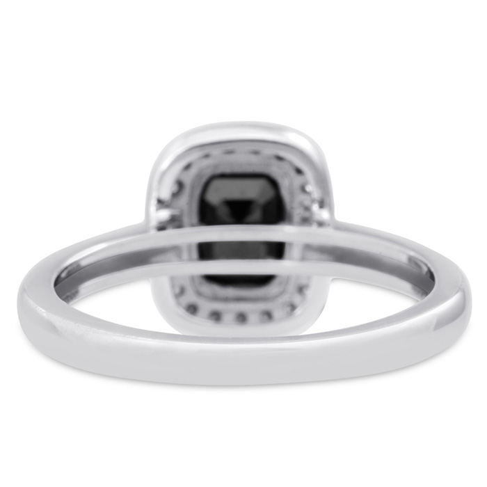 This black diamond and white diamond ring features a 3/4 carat emerald shape black diamond. Black diamond is in I3 clarity. It is surrounded with a halo of diamonds in H-I color, SI2-I1 clarity at 0.11ct total diamond weight. The ring contains 22 diamonds total and is crafted in 14 karat white gold. Total gem weight is 0.85 carats.