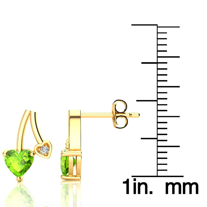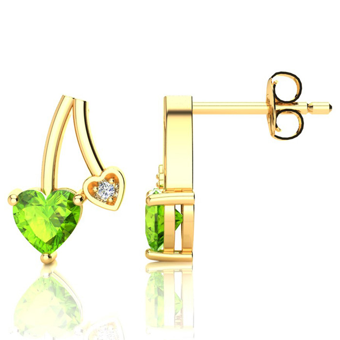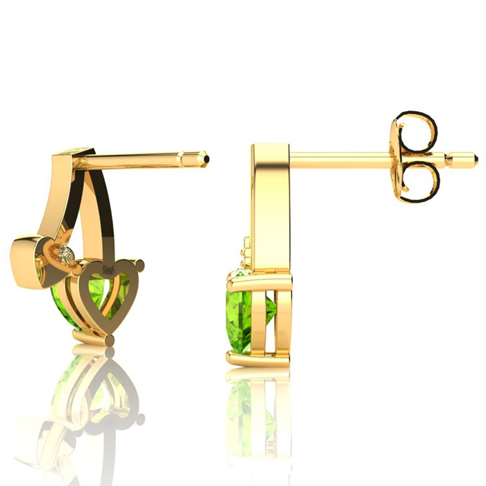 These earrings feature two 5mm heart shaped peridot gemstones at approximately 3/4 carats total weight. They are accented with two sparkling diamonds in I-J color, I1-I2 clarity. These earrings are in 10 karat yellow gold and have secure post with friction backs.