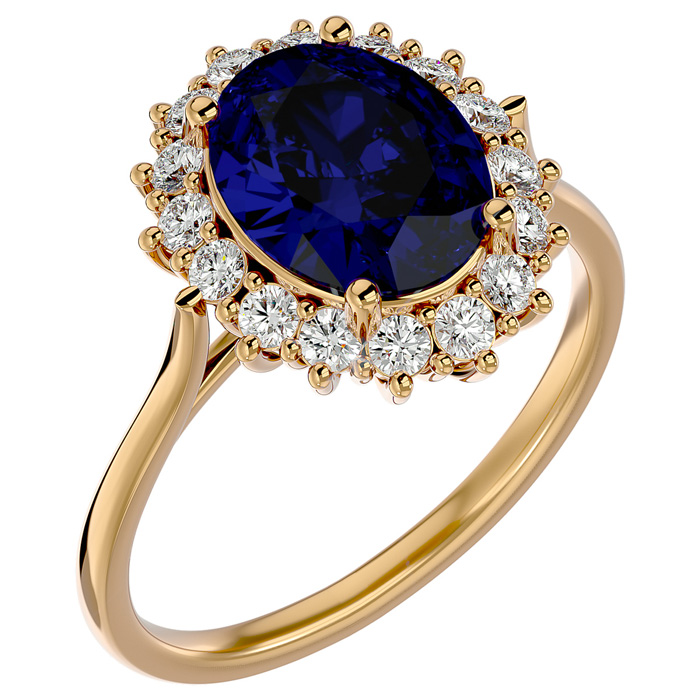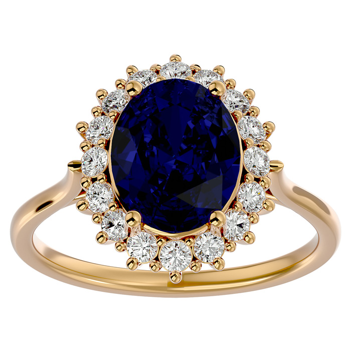 This elegant gemstone ring features one 10x8mm oval shape sapphire gemstone at approximately 3 1/10 carats. It is surrounded by 16 sparkling diamonds in I-J color, I1-I2 clarity at 1/2 carat total weight. Total gem weight is approximately 3.60 carats. This ring is in 14 karat yellow gold.