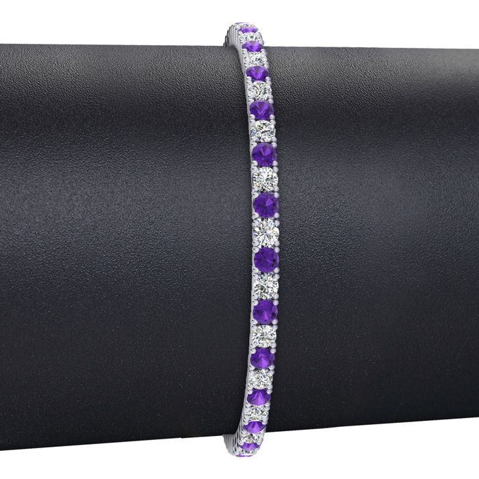 This classic gemstone bracelet features shimmering white diamonds in J-K color, I1-I2 clarity and amethyst gemstones. The 6 inch bracelet contains 57 gemstones and diamonds at 2.56 carats. The 6.5 inch bracelet contains 62 gemstones and diamonds at 2.79 carats. The 7 inch bracelet contains 67 gemstones and diamonds at 3.01 carats. The 7.5 inch bracelet contains 72 gemstones and diamonds at 3.24 carats. The 8 inch bracelet contains 76 gemstones and diamonds at 3.42 carats. The 8.5 inch bracelet contains 81 gemstones and diamonds at 3.64 carats. The 9 inch bracelet contains 86 gemstones and diamonds at 3.87 carats. This bracelet is approximately 2.25mm wide and is crafted in 14 karat white gold. This bracelet has a secure, box with tongue and safety clasp.