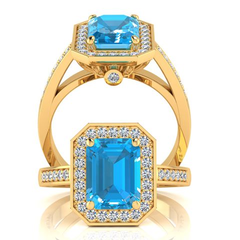 This stunning gemstone and halo diamond ring features one 9x7mm emerald shape blue topaz gemstone at 2.75 carats. It is surrounded by 42 sparkling diamonds in a halo and down the band in I-J color, SI2-I1 clarity at 0.43 carats. Total gem weight is 3.18 carats. This ring is crafted in 14 karat yellow gold.