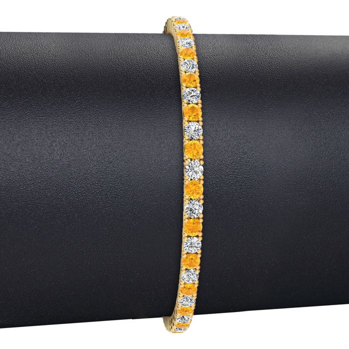 This classic gemstone bracelet features shimmering white diamonds in J-K color, I1-I2 clarity and citrine gemstones. The 6 inch bracelet contains 57 gemstones and diamonds at 2.56 carats. The 6.5 inch bracelet contains 62 gemstones and diamonds at 2.79 carats. The 7 inch bracelet contains 67 gemstones and diamonds at 3.01 carats. The 7.5 inch bracelet contains 72 gemstones and diamonds at 3.24 carats. The 8 inch bracelet contains 76 gemstones and diamonds at 3.42 carats. The 8.5 inch bracelet contains 81 gemstones and diamonds at 3.64 carats. The 9 inch bracelet contains 86 gemstones and diamonds at 3.87 carats. This bracelet is approximately 2.25mm wide and is crafted in 14 karat yellow gold. This bracelet has a secure, box with tongue and safety clasp.