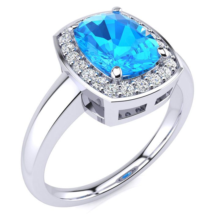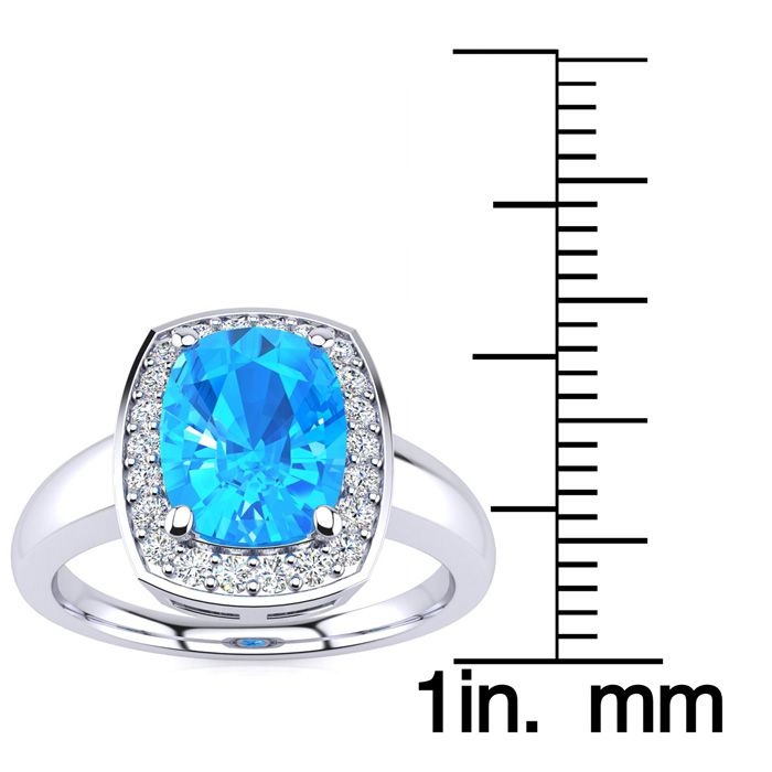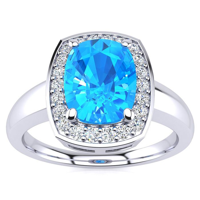 This stunning gemstone and diamond ring features one 9x7mm cushion shape blue topaz gemstone at 2.75 carats. It is surrounded by 22 sparkling diamonds in I-J color, I1-I2 clarity at 0.15 carats. Total gem weight is 2.90 carats. This ring is crafted in 14 karat white gold.