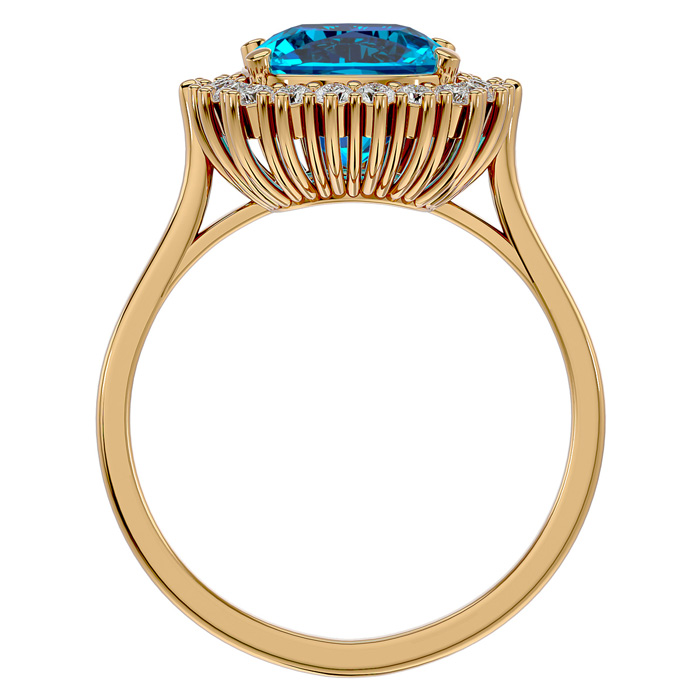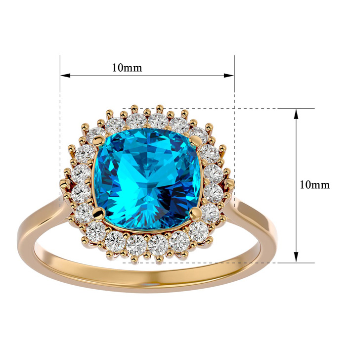 Retrograde Birthstones™ 3 Carat Cushion Cut Blue Topaz and Halo Diamond Ring In 14K Yellow Gold