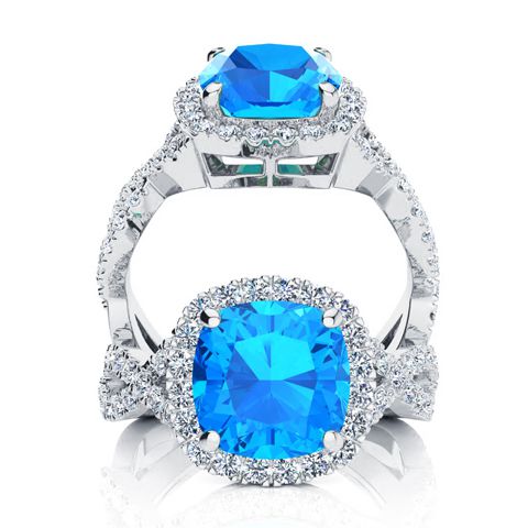 3 Carat Cushion Cut Blue Topaz and Halo Diamond Ring With Fancy Band In 14 Karat White Gold