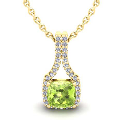 This stunning gemstone and halo diamond necklace features one 8x8mm cushion cut peridot gemstone at 2.60 carats. It is surrounded by 33 sparkling diamonds in a halo in I-J color, SI2-I1 clarity at 0.41 carats. Total gem weight is 3.01 carats. This necklace is crafted in 14 karat yellow gold and comes with an 18 inch cable chain with spring-ring clasp.