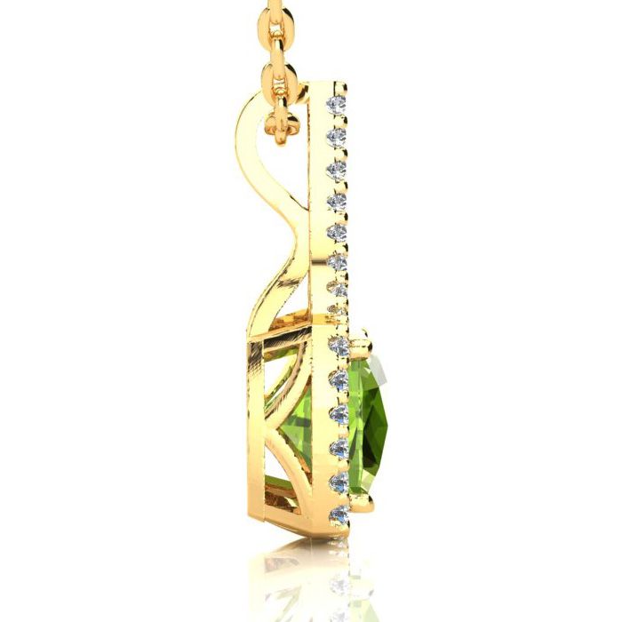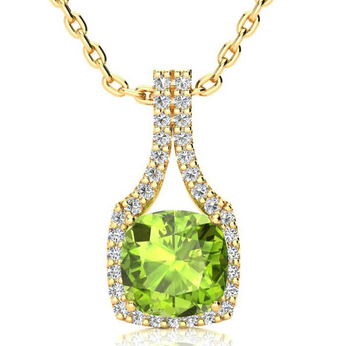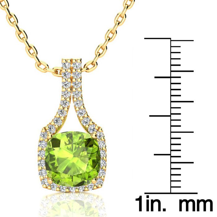 3 Carat Cushion Cut Peridot and Classic Halo Diamond Necklace In 14 Karat Yellow Gold, 18 Inches