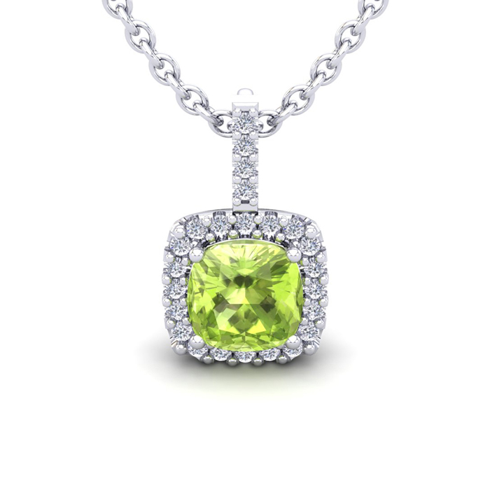 This stunning gemstone and halo diamond necklace features one 8x8mm cushion cut peridot gemstone at 2.60 carats. It is surrounded by 24 sparkling diamonds in a halo in I-J color, SI2-I1 clarity at 0.30 carats. Total gem weight is 2.90 carats. This necklace is crafted in 14 karat white gold and comes with an 18 inch cable chain with spring-ring clasp.