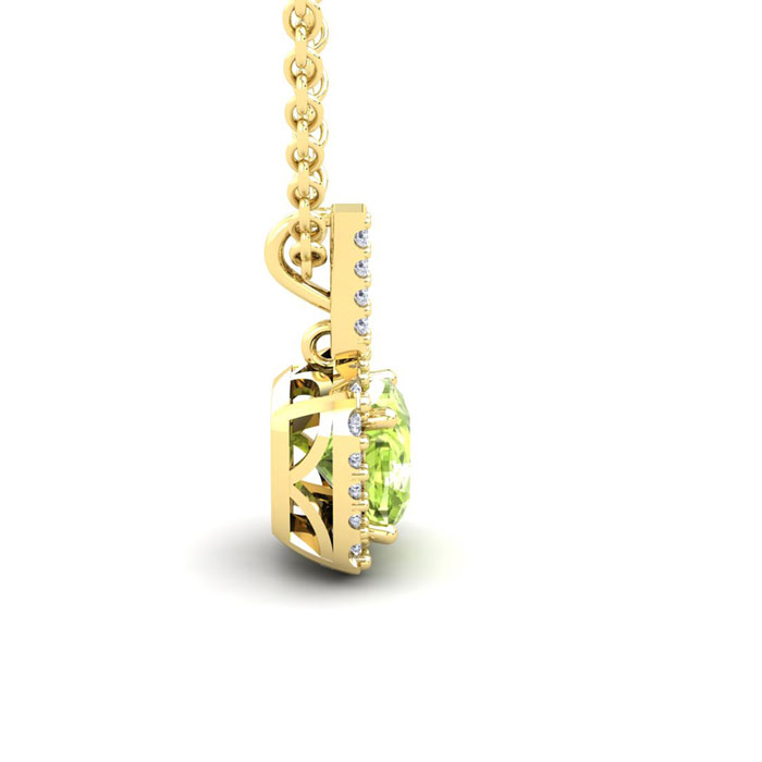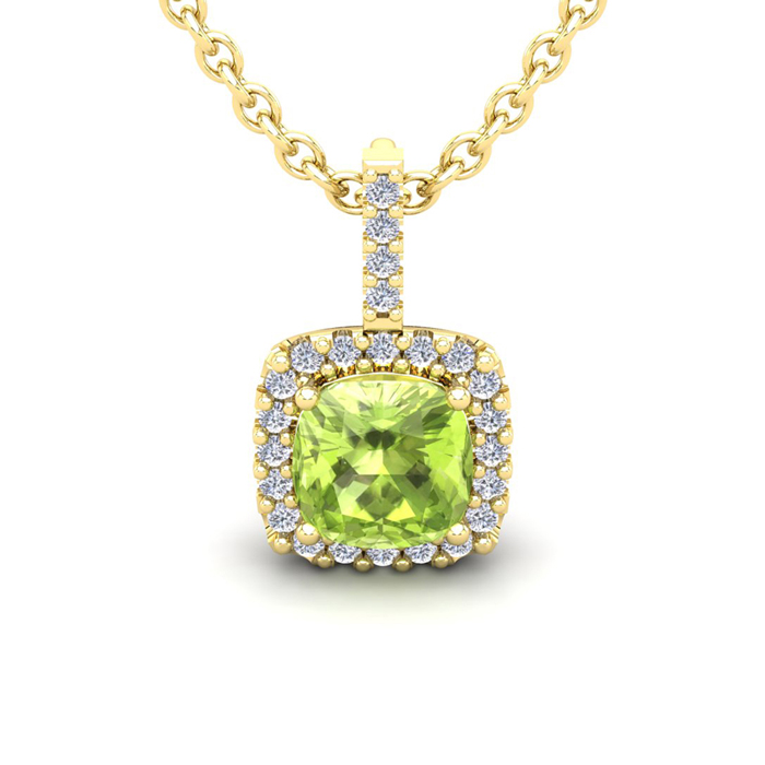 3 Carat Cushion Cut Peridot and Halo Diamond Necklace In 14 Karat Yellow Gold, 18 Inches