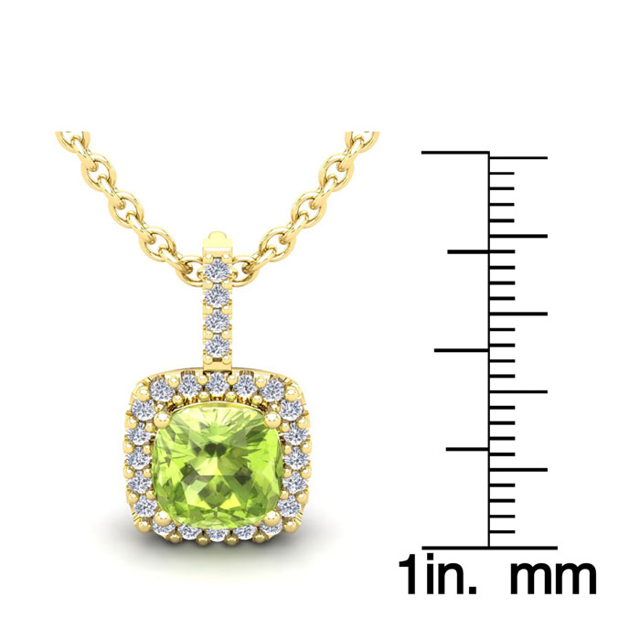 This stunning gemstone and halo diamond necklace features one 8x8mm cushion cut peridot gemstone at 2.60 carats. It is surrounded by 24 sparkling diamonds in a halo in I-J color, SI2-I1 clarity at 0.30 carats. Total gem weight is 2.90 carats. This necklace is crafted in 14 karat yellow gold and comes with an 18 inch cable chain with spring-ring clasp.