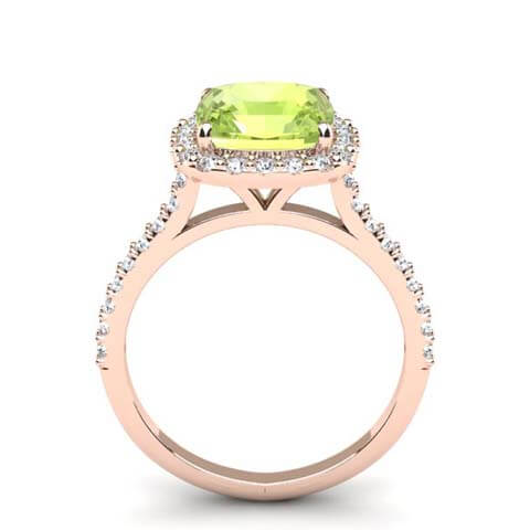 Choosing whether to have accent diamonds on your peridot ring is truly a matter of style and taste. A peridot ring can look very nice as a solitaire but adding diamonds is by far the most popular design choice. Diamonds do increase the price of a peridot ring but not as much as you might think as the diamonds are generally small. A popular peridot ring design is to have diamonds surrounding the peridot in a halo frame. The diamond halo makes the peridot look a bit larger but most importantly it provides a distinctive color contrast that makes the peridot quite beautiful. Another popular design is to have accent diamonds on the sides of the peridot ring. This type of peridot ring design lends an elegance without being too flashy. Without a doubt, combining both a diamond halo and accent diamond in the ring is the most popular choice.
