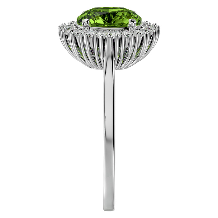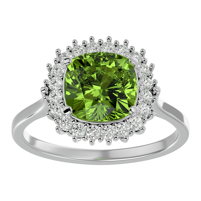 3 Carat Cushion Cut Peridot and Halo Diamond Ring In 14K White Gold
