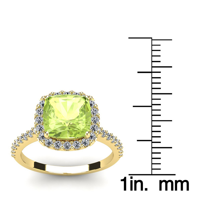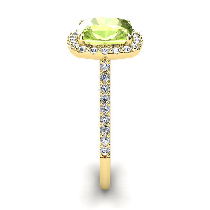 3 Carat Cushion Cut Peridot and Halo Diamond Ring In 14K Yellow Gold