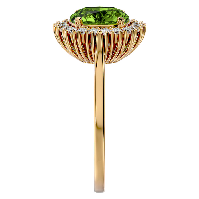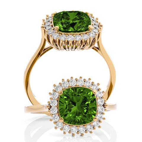 3 Carat Cushion Cut Peridot and Halo Diamond Ring In 14K Yellow Gold