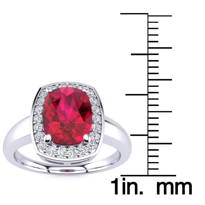 This stunning gemstone and diamond ring features one 9x7mm cushion shape ruby gemstone at 2.90 carats. It is surrounded by 22 sparkling diamonds in I-J color, I1-I2 clarity at 0.15 carats. Total gem weight is 3.05 carats. This ring is crafted in 14 karat white gold.