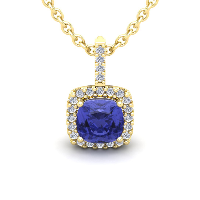 This stunning gemstone and halo diamond necklace features one 8x8mm cushion cut tanzanite gemstone at 2.60 carats. It is surrounded by 24 sparkling diamonds in a halo in I-J color, SI2-I1 clarity at 0.30 carats. Total gem weight is 2.90 carats. This necklace is crafted in 14 karat yellow gold and comes with an 18 inch cable chain with spring-ring clasp.
