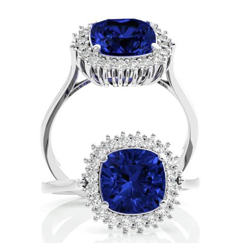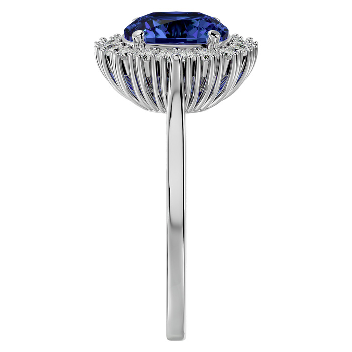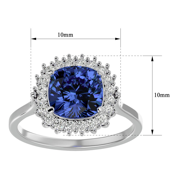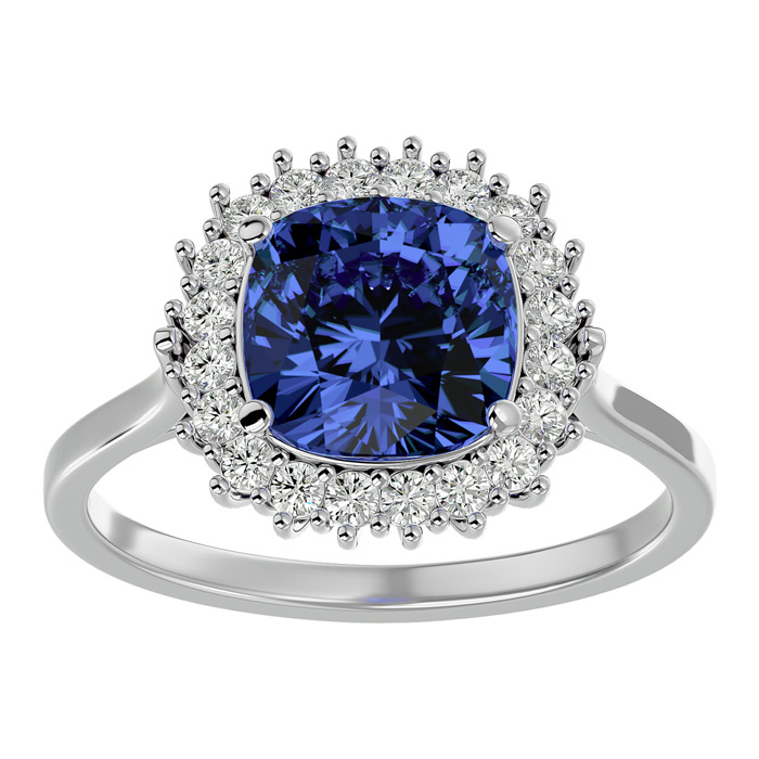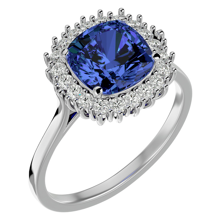 3 Carat Cushion Cut Tanzanite and Halo Diamond Ring In 14K White Gold