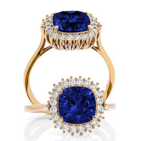 3 Carat Cushion Cut Tanzanite and Halo Diamond Ring In 14K Yellow Gold