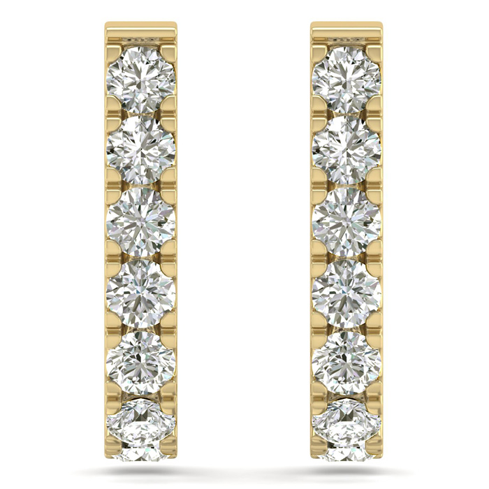 These classic diamond J hoop earrings feature 14 sparkling diamonds in K-L color, I2-I3 clarity at approximately 3 carats. These earrings dangle down about 1 inch and are in 14 karat yellow gold. They have comfortable and secure post with friction backs.