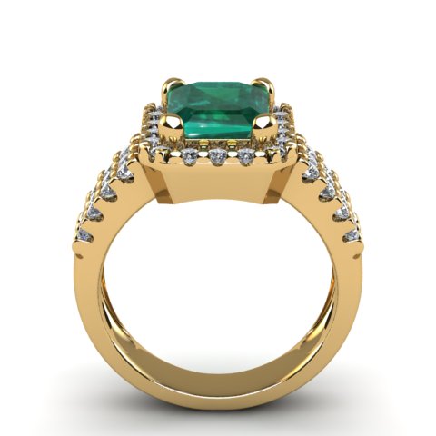 This stunning gemstone and diamond ring features one 9x7mm emerald shape emerald gemstone at 2.15 carats. It is surrounded by 42 sparkling diamonds in a halo and down the band in I-J color, I1-I2 clarity at 0.95 carats. Total gem weight is 3.10 carats. This ring is crafted in 14 karat yellow gold.