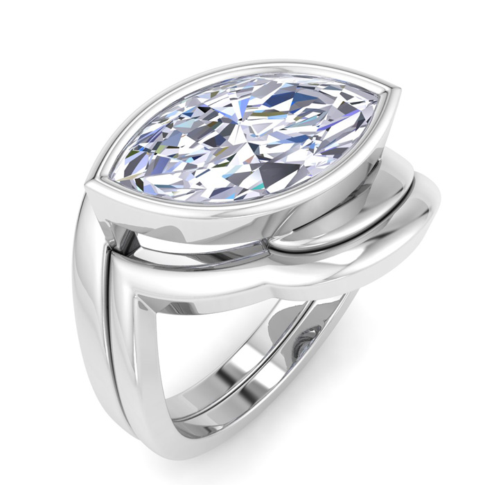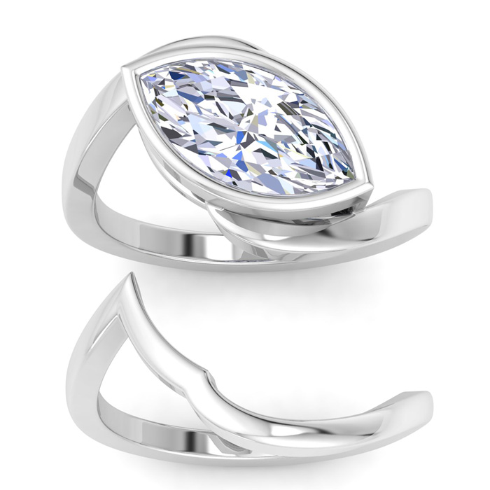 This lab grown diamond ring features a 3 carat marquise shape center lab grown diamond in G-H color, VS clarity in a sideways bezel setting. This ring is in 14 karat white gold. This ring includes a matching gold band.