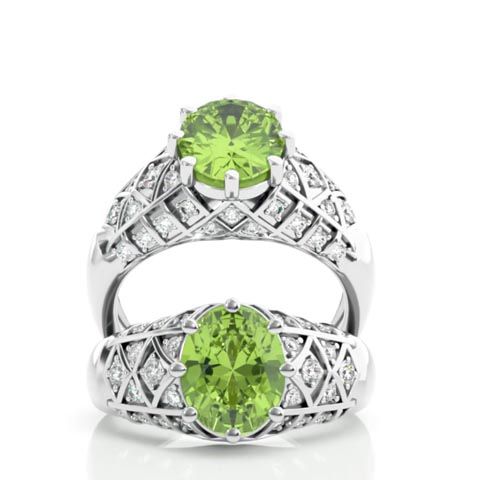 3 Carat Oval Shape Peridot and Diamond Ring In 10 Karat White Gold