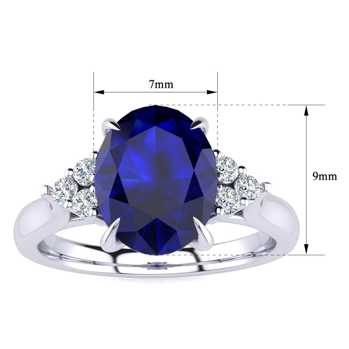 This stunning gemstone and diamond ring features one 9x7mm oval shape sapphire gemstone at 2.85 carats. It is surrounded by 6 sparkling diamonds in I-J color, I1-I2 clarity at 0.09 carats. Total gem weight is approximately 2.94 carats. This ring is crafted in 14 karat white gold.