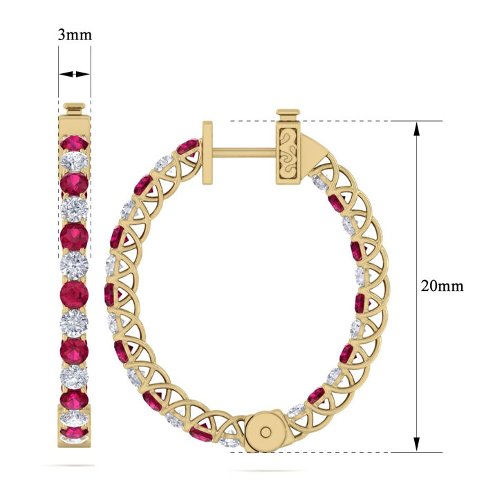 3 Carat Ruby and Diamond Hoop Earrings In 14 Karat Yellow Gold, 3/4 Inch