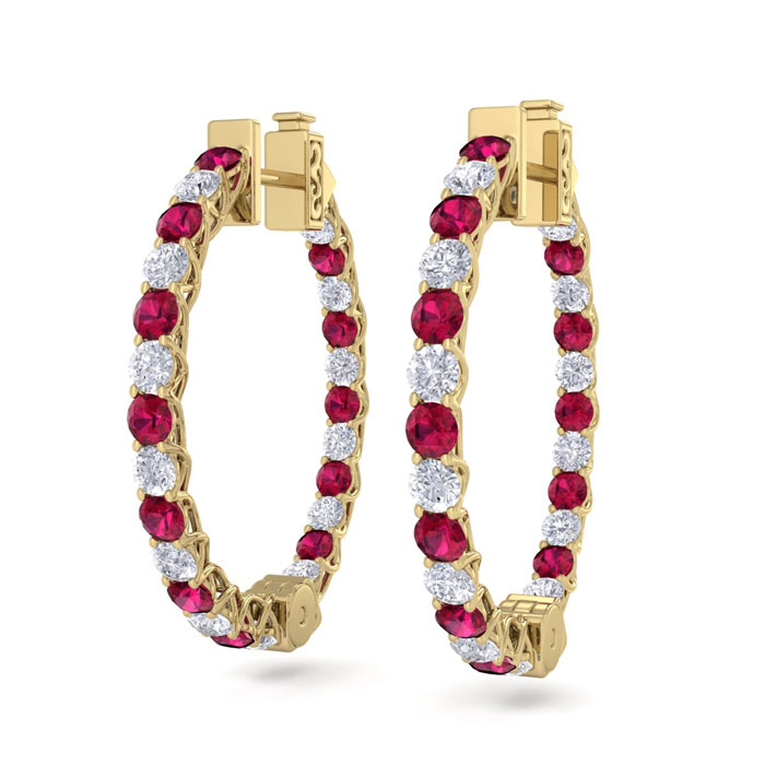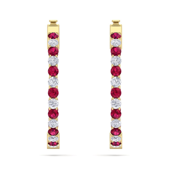 3 Carat Ruby and Diamond Hoop Earrings In 14 Karat Yellow Gold, 3/4 Inch