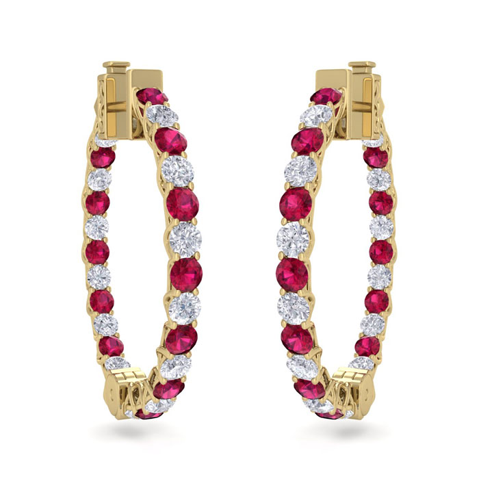 These classic hoop earrings feature 25 sparkling diamonds in J-K color, I2-I3 clarity and 25 ruby gemstones. Total carat weight is 3 carats. These earrings are in 14 karat yellow gold and have secure hidden snap backs. These earrings are 3/4 inch in diameter.