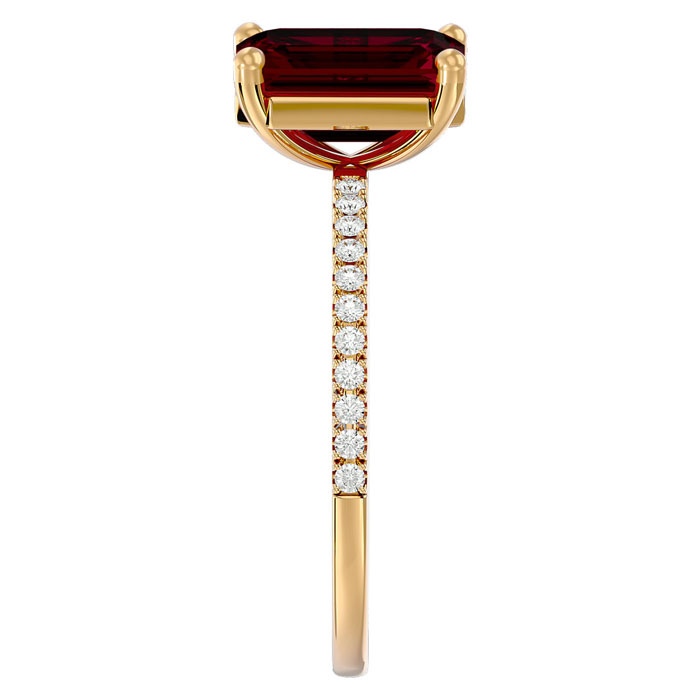 This elegant gemstone and diamond ring features one 9x7mm emerald shape ruby gemstone weighing approximately 2.90 carats. There are 22 sparkling side diamonds totaling approximately 1/5 carat. Total carat weight is approximately 3.10 carats. Diamond color is I-J, diamond clarity is I1-I2. This ring is in 14 karat yellow gold.