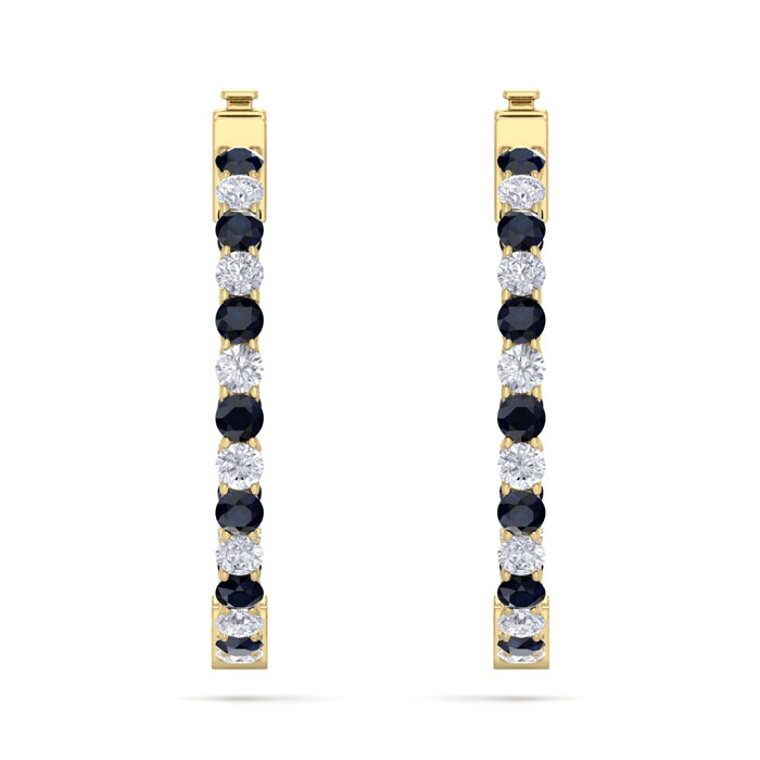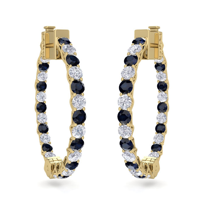 These classic hoop earrings feature 25 sparkling diamonds in I-J color, I1-I2 clarity and 25 sapphire gemstones. Total carat weight is 3 carats. These earrings are in 14 karat yellow gold and have secure hidden snap backs. These earrings are 3/4 inch in diameter.