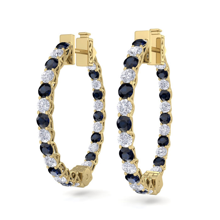 3 Carat Sapphire and Diamond Hoop Earrings In 14 Karat Yellow Gold, 3/4 Inch