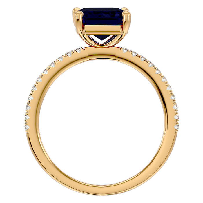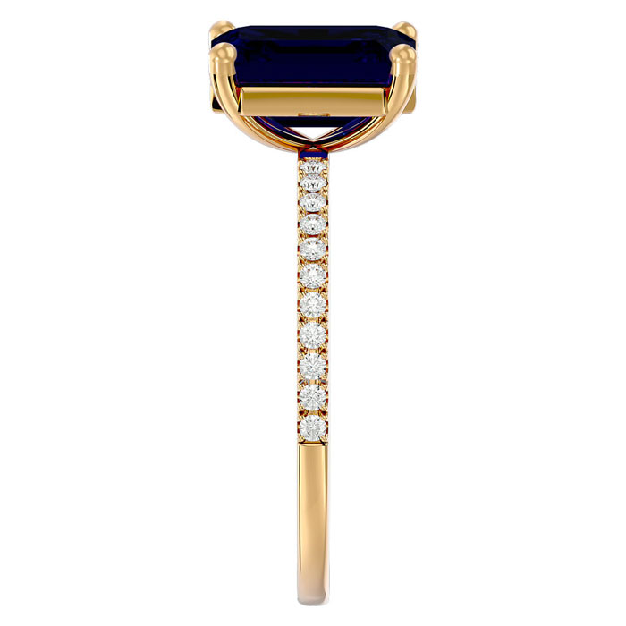This elegant gemstone and diamond ring features one 9x7mm emerald shape sapphire gemstone weighing approximately 2.95 carats. There are 22 sparkling side diamonds totaling approximately 1/5 carat. Total carat weight is approximately 3.15 carats. Diamond color is I-J, diamond clarity is I1-I2. This ring is in 14 karat yellow gold.