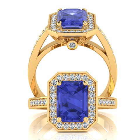 This stunning gemstone and halo diamond ring features one 9x7mm emerald shape tanzanite gemstone at 2.45 carats. It is surrounded by 42 sparkling diamonds in a halo and down the band in I-J color, SI2-I1 clarity at 0.43 carats. Total gem weight is 2.88 carats. This ring is crafted in 14 karat yellow gold.