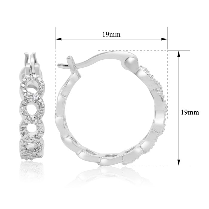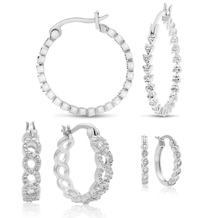 Three Pairs For The Price Of One! These diamond hoop earrings are delicate and perfect for day to evening wear. The earrings are embellished with intricate infinity shaped detailing throughout. Each pair of hoops has diamond weight is 0.01 carats in J-K color, I1-I2 clarity.