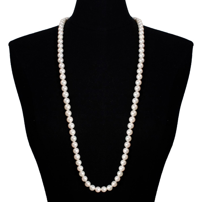 This classic hand-knotted 10mm pearl necklace is 36 inches long, with a 14 karat yellow gold fancy clasp. Necklace features AA quality cultured pearls.