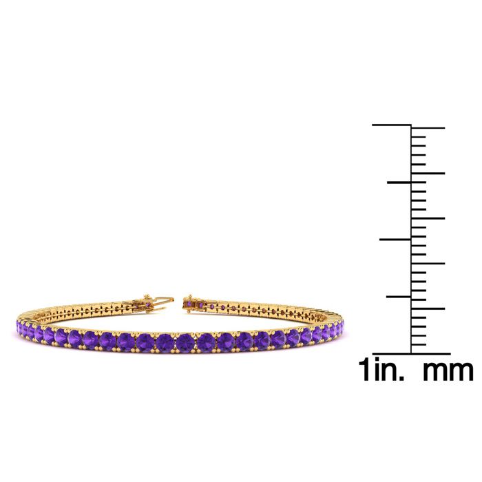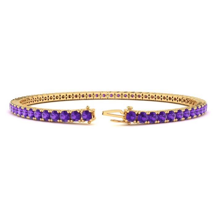 This classic gemstone bracelet features shimmering amethyst gemstones. The 6 inch bracelet contains 50 gemstones at 3.48 carats. The 6.5 inch bracelet contains 55 gemstones at 3.60 carats. The 7 inch bracelet contains 59 gemstones at 3.90 carats. The 7.5 inch bracelet contains 63 gemstones at 4.20 carats. The 8 inch bracelet contains 67 gemstones at 4.44 carats. The 8.5 inch bracelet contains 72 gemstones at 4.67 carats. The 9 inch bracelet contains 76 gemstones at 5.04 carats. This bracelet is approximately 2.5mm wide and is crafted in 14 karat yellow gold. This bracelet has a secure, box with tongue and safety clasp.