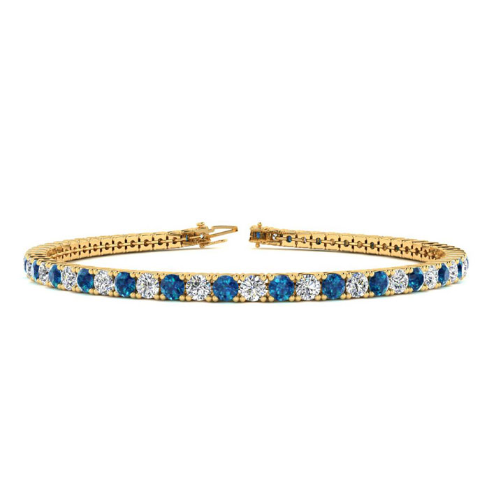 This classic mens diamond bracelet features shimmering white diamonds in J-K color, I1-I2 clarity and blue diamonds in I3 clarity. The 6 inch bracelet contains 58 blue and white diamonds at 3.48 carats. The 6.5 inch bracelet contains 55 blue and white diamonds at 3.60 carats. The 7 inch bracelet contains 59 blue and white diamonds at 3.90 carats. The 7.5 inch bracelet contains 63 blue and white diamonds at 4.20 carats. The 8 inch bracelet contains 67 blue and white diamonds at 4.44 carats. The 8.5 inch bracelet contains 72 blue and white diamonds at 4.67 carats. The 9 inch bracelet contains 76 blue and white diamonds at 5.04 carats. This bracelet is approximately 2.5mm wide and is crafted in 14 karat yellow gold. This bracelet has a secure, box with tongue and safety clasp.