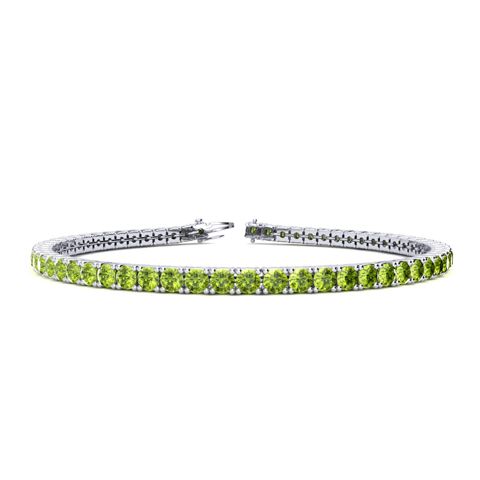This classic gemstone bracelet features shimmering peridot gemstones. The 6 inch bracelet contains 50 gemstones at 3.48 carats. The 6.5 inch bracelet contains 55 gemstones at 3.60 carats. The 7 inch bracelet contains 59 gemstones at 3.90 carats. The 7.5 inch bracelet contains 63 gemstones at 4.20 carats. The 8 inch bracelet contains 67 gemstones at 4.44 carats. The 8.5 inch bracelet contains 72 gemstones at 4.67 carats. The 9 inch bracelet contains 76 gemstones at 5.04 carats. This bracelet is approximately 2.5mm wide and is crafted in 14 karat white gold. This bracelet has a secure, box with tongue and safety clasp.