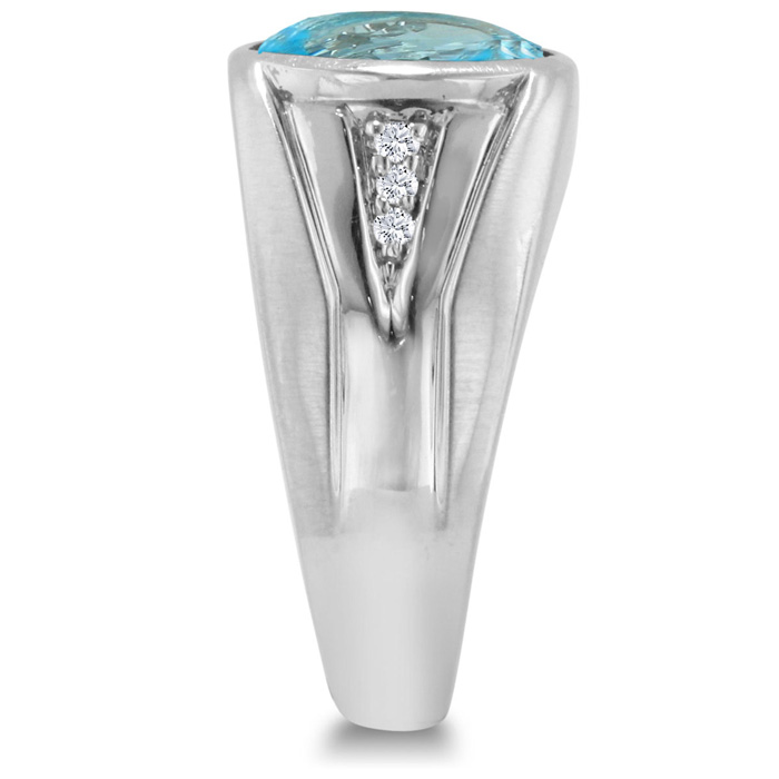 This is not your ordinary male's ring, I just love the piercing blue topaz paired with the white gold and diamonds.