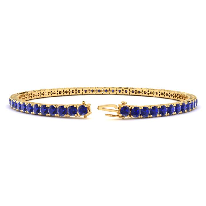 This classic gemstone bracelet features shimmering sapphire gemstones. The 6 inch bracelet contains 57 gemstones at 3.42 carats. The 6.5 inch bracelet contains 62 gemstones at 3.72 carats. The 7 inch bracelet contains 67 gemstones at 4.02 carats. The 7.5 inch bracelet contains 72 gemstones at 4.32 carats. The 8 inch bracelet contains 76 gemstones at 4.56 carats. The 8.5 inch bracelet contains 81 gemstones at 4.86 carats. The 9 inch bracelet contains 86 gemstones at 5.16 carats. This bracelet is approximately 2.25mm wide and is crafted in 14 karat yellow gold. This bracelet has a secure, box with tongue and safety clasp.