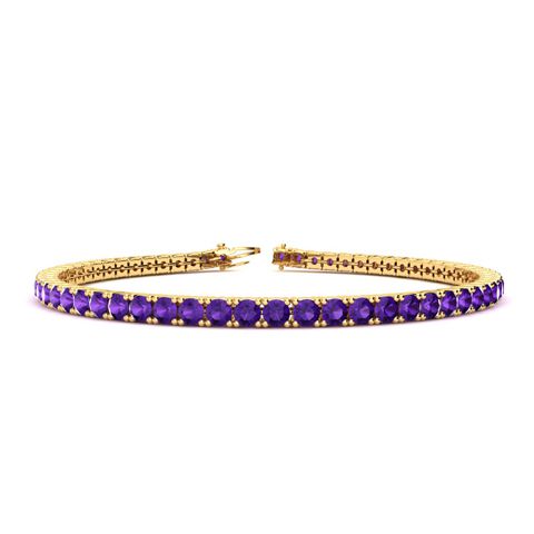 This classic gemstone bracelet features shimmering amethyst gemstones. The 6 inch bracelet contains 50 gemstones at 3.48 carats. The 6.5 inch bracelet contains 55 gemstones at 3.60 carats. The 7 inch bracelet contains 59 gemstones at 3.90 carats. The 7.5 inch bracelet contains 63 gemstones at 4.20 carats. The 8 inch bracelet contains 67 gemstones at 4.44 carats. The 8.5 inch bracelet contains 72 gemstones at 4.74 carats. The 9 inch bracelet contains 76 gemstones at 5.04 carats. This bracelet is approximately 2.5mm wide and is crafted in 14 karat yellow gold. This bracelet has a secure, box with tongue and safety clasp.