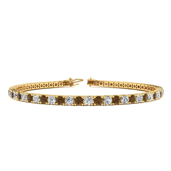 This classic mens diamond bracelet features shimmering white diamonds in J-K color, I1-I2 clarity and chocolate bar brown champagne diamonds in I3 clarity. The 6 inch bracelet contains 58 chocolate bar brown champagne and white diamonds at 3.48 carats. The 6.5 inch bracelet contains 55 chocolate bar brown champagne and white diamonds at 3.60 carats. The 7 inch bracelet contains 59 chocolate bar brown champagne and white diamonds at 3.90 carats. The 7.5 inch bracelet contains 63 chocolate bar brown champagne and white diamonds at 4.20 carats. The 8 inch bracelet contains 67 chocolate bar brown champagne and white diamonds at 4.44 carats. The 8.5 inch bracelet contains 72 chocolate bar brown champagne and white diamonds at 4.74 carats. The 9 inch bracelet contains 76 chocolate bar brown champagne and white diamonds at 5.04 carats. This bracelet is approximately 2.5mm wide and is crafted in 14 karat yellow gold. This bracelet has a secure, box with tongue and safety clasp.