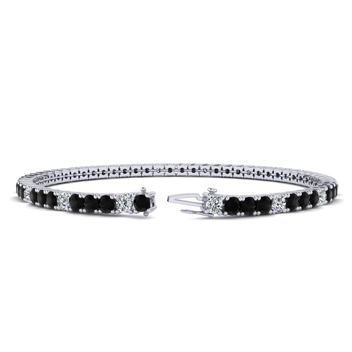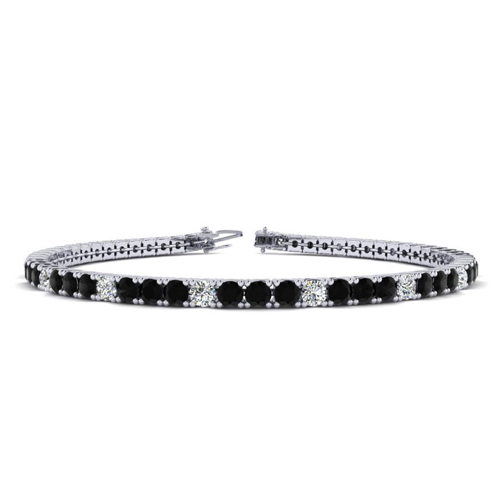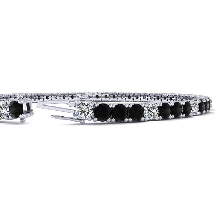 This classic mens diamond bracelet features shimmering white diamonds in J-K color, I1-I2 clarity and black diamonds in I3 clarity. The 6 inch bracelet contains 58 black and white diamonds at 3.48 carats. The 6.5 inch bracelet contains 55 black and white diamonds at 3.60 carats. The 7 inch bracelet contains 59 black and white diamonds at 3.90 carats. The 7.5 inch bracelet contains 63 black and white diamonds at 4.20 carats. The 8 inch bracelet contains 67 black and white diamonds at 4.44 carats. The 8.5 inch bracelet contains 72 black and white diamonds at 4.74 carats. The 9 inch bracelet contains 76 black and white diamonds at 5.04 carats. This bracelet is approximately 2.5mm wide and is crafted in 14 karat white gold. This bracelet has a secure, box with tongue and safety clasp.