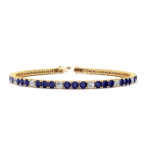 This classic gemstone bracelet features shimmering white diamonds in J-K color, I1-I2 clarity and sapphire gemstones. The 6 inch bracelet contains 57 gemstones and diamonds at 3.14 carats. The 6.5 inch bracelet contains 62 gemstones and diamonds at 3.42 carats. The 7 inch bracelet contains 67 gemstones and diamonds at 3.70 carats. The 7.5 inch bracelet contains 72 gemstones and diamonds at 3.96 carats. The 8 inch bracelet contains 76 gemstones and diamonds at 4.18 carats. The 8.5 inch bracelet contains 81 gemstones and diamonds at 4.46 carats. The 9 inch bracelet contains 86 gemstones and diamonds at 4.74 carats. This bracelet is approximately 2.25mm wide and is crafted in 14 karat yellow gold. This bracelet has a secure, box with tongue and safety clasp.