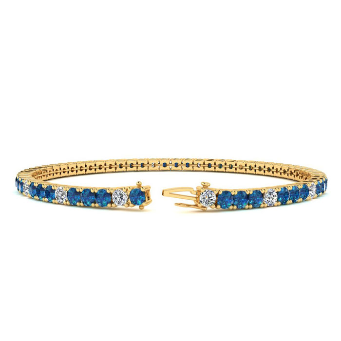 This classic mens diamond bracelet features shimmering white diamonds in J-K color, I1-I2 clarity and blue diamonds in I3 clarity. The 6 inch bracelet contains 58 blue and white diamonds at 3.48 carats. The 6.5 inch bracelet contains 55 blue and white diamonds at 3.60 carats. The 7 inch bracelet contains 59 blue and white diamonds at 3.90 carats. The 7.5 inch bracelet contains 63 blue and white diamonds at 4.20 carats. The 8 inch bracelet contains 67 blue and white diamonds at 4.44 carats. The 8.5 inch bracelet contains 72 blue and white diamonds at 4.74 carats. The 9 inch bracelet contains 76 blue and white diamonds at 5.04 carats. This bracelet is approximately 2.5mm wide and is crafted in 14 karat yellow gold. This bracelet has a secure, box with tongue and safety clasp.