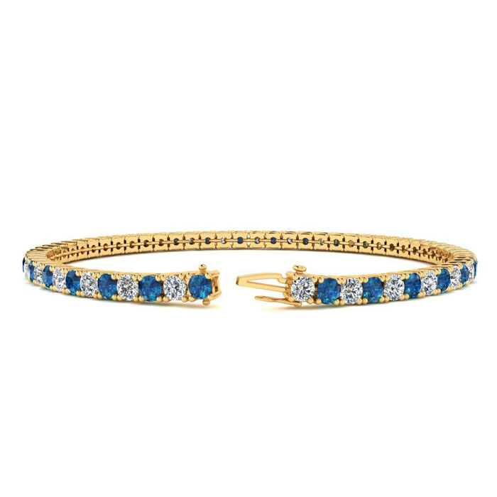 This classic mens diamond bracelet features shimmering white diamonds in J-K color, I1-I2 clarity and blue diamonds in I3 clarity. The 6 inch bracelet contains 58 blue and white diamonds at 3.48 carats. The 6.5 inch bracelet contains 55 blue and white diamonds at 3.60 carats. The 7 inch bracelet contains 59 blue and white diamonds at 3.90 carats. The 7.5 inch bracelet contains 63 blue and white diamonds at 4.20 carats. The 8 inch bracelet contains 67 blue and white diamonds at 4.44 carats. The 8.5 inch bracelet contains 72 blue and white diamonds at 4.74 carats. The 9 inch bracelet contains 76 blue and white diamonds at 5.04 carats. This bracelet is approximately 2.5mm wide and is crafted in 14 karat yellow gold. This bracelet has a secure, box with tongue and safety clasp.