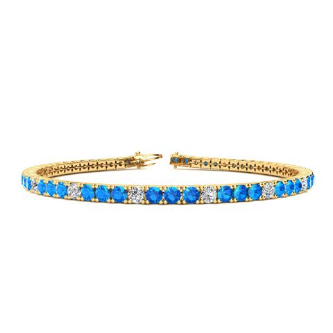 This classic gemstone bracelet features shimmering white diamonds in J-K color, I1-I2 clarity and blue topaz gemstones. The 6 inch bracelet contains 57 gemstones and diamonds at 3.14 carats. The 6.5 inch bracelet contains 62 gemstones and diamonds at 3.42 carats. The 7 inch bracelet contains 67 gemstones and diamonds at 3.70 carats. The 7.5 inch bracelet contains 72 gemstones and diamonds at 3.96 carats. The 8 inch bracelet contains 76 gemstones and diamonds at 4.18 carats. The 8.5 inch bracelet contains 81 gemstones and diamonds at 4.46 carats. The 9 inch bracelet contains 86 gemstones and diamonds at 4.74 carats. This bracelet is approximately 2.25mm wide and is crafted in 14 karat yellow gold. This bracelet has a secure, box with tongue and safety clasp.