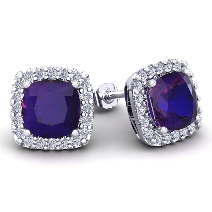 These stunning gemstone and halo diamond earrings feature two 8x8mm cushion cut amethyst gemstones at 4.20 carats. The gemstones are surrounded by 40 sparkling diamonds in a halo in I-J color, SI2-I1 clarity at 0.50 carats. Total gem weight is 4.70 carats. These earrings are crafted in 14 karat white gold and come with comfortable and secure post with friction backs.